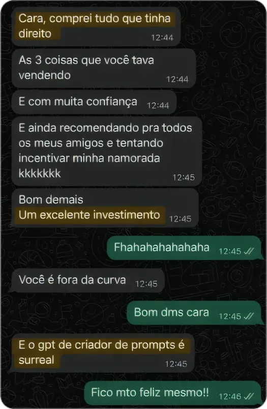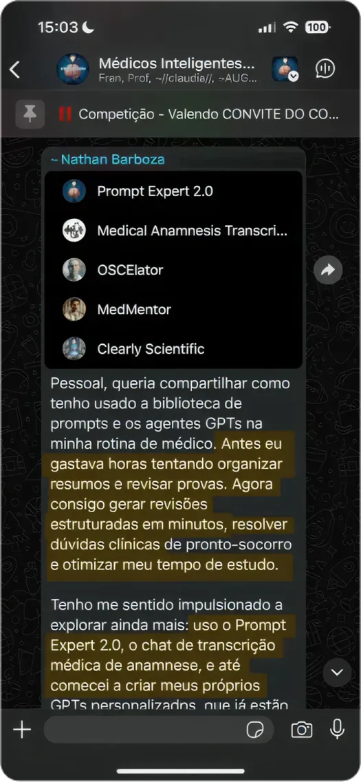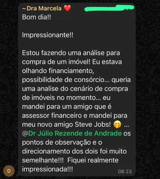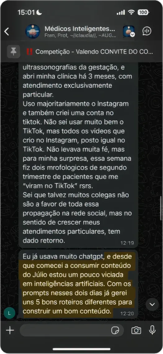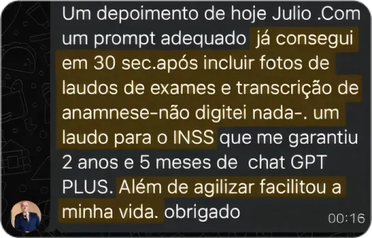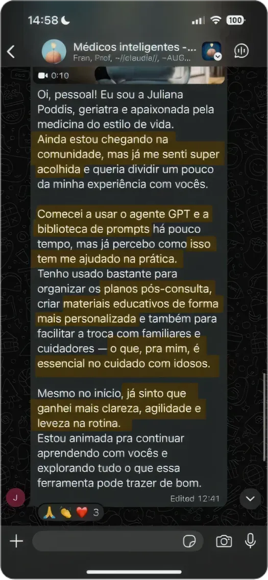 Sou ginecologista em Franca e, percebi que o maior valor está na comunidade criada pelo Júlio. Antes eu me sentia sozinho para falar de IA, hoje troco experiências diariamente e aprendo muito mais. A sensação é de ter um superpoder: minha produtividade aumentou de forma impressionante. Obrigado, Júlio, pelo incentivo e por liderar um grupo tão rico e transformador.
