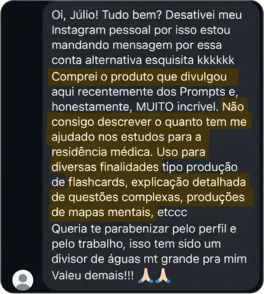 Sou ginecologista no interior de SP e, graças ao curso do Júlio, deixei de ser um ‘jurássico’ para me tornar um caçador de IA. Já tinha comprado outros cursos, mas nunca consegui aplicar na prática. Com a didática simples e acessível, tudo mudou: meu receituário, minhas consultas e até a forma de estudar. Hoje uso IA todos os dias, aprendo continuamente e sinto a transformação real na minha rotina. Obrigado, Júlio, por fazer a diferença e deixar um legado.